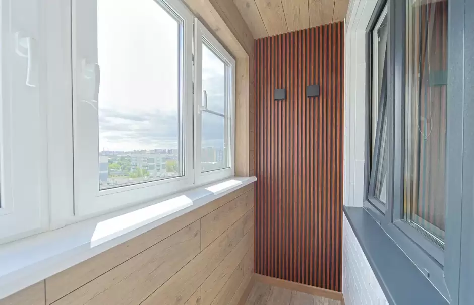 Установлено несколько видов освещения.Сроки: 1 день-демонта/монтаж окон, 5 дней - обшивка балкона.