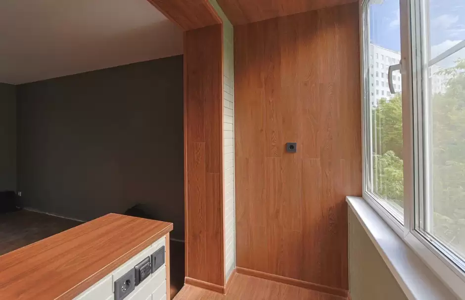 Обшивка: Комбинированная облицовка различными видами материала: стеновой паркет и ламинат. Остекление: Профильная система Rehau Grazio 70 с качественной немецкой фурнитурой Roto обеспечивает герметичность и долговечность конструкции. Электрика: Полностью выведены электрические сети, установлены осветительные приборы. Для дополнительного комфорта установлено напольное покрытие с функцией подогрева — теплый пол инфракрасного типа.Заказчик высоко оценил проделанные работы и остался доволен результатом. Дизайнерская концепция оформления позволила создать комфортную зону отдыха на лоджии площадью 3 м².