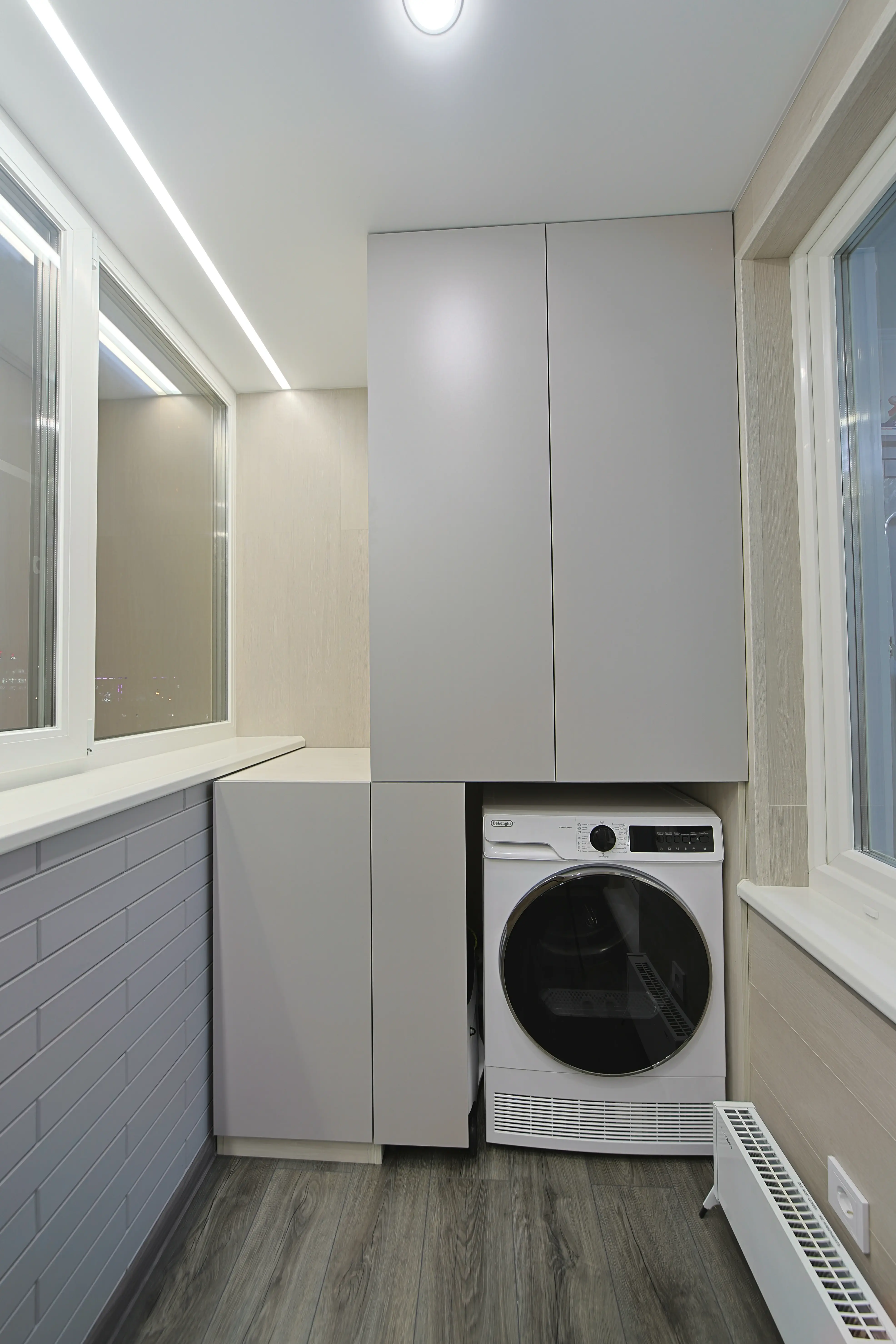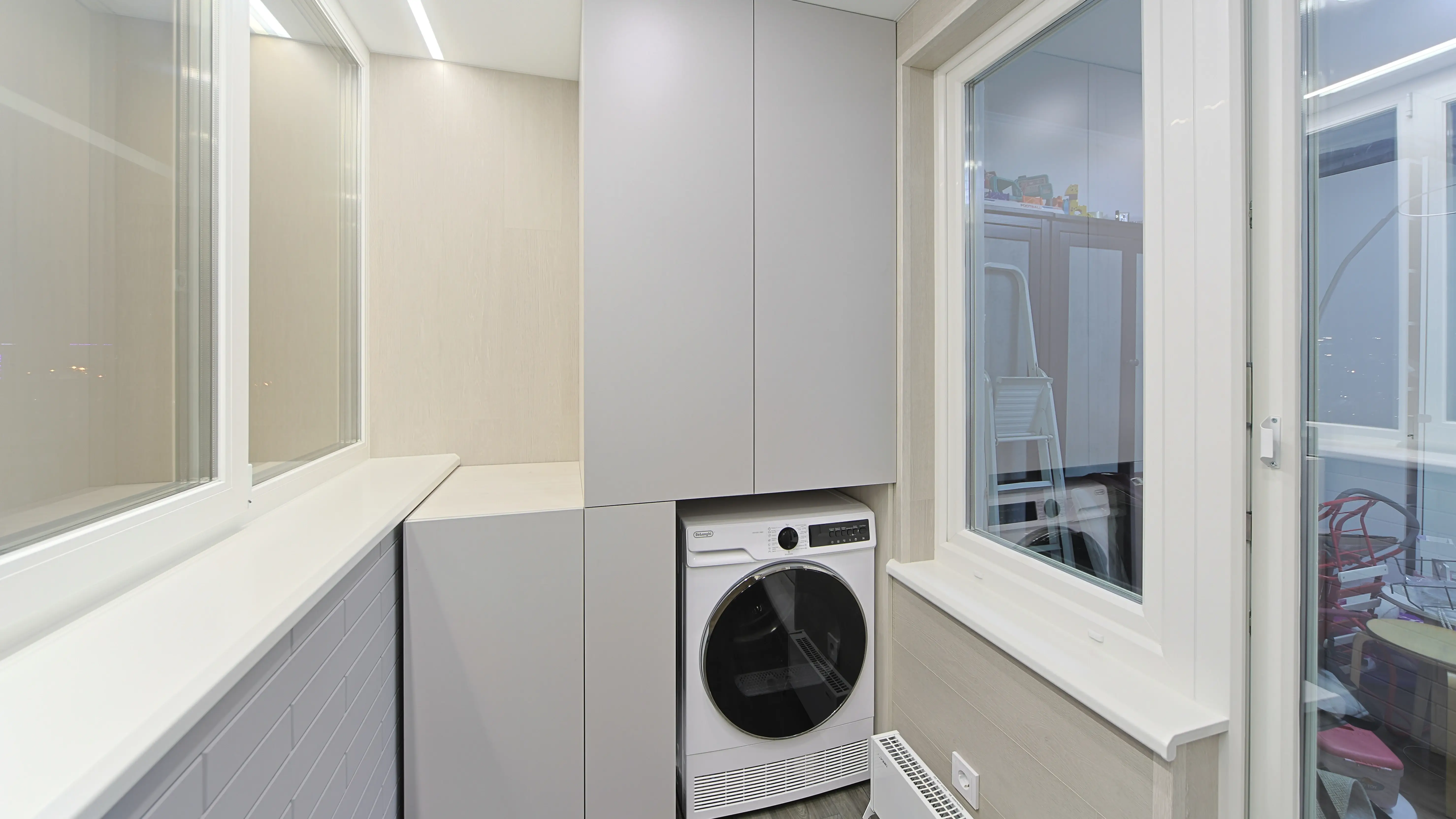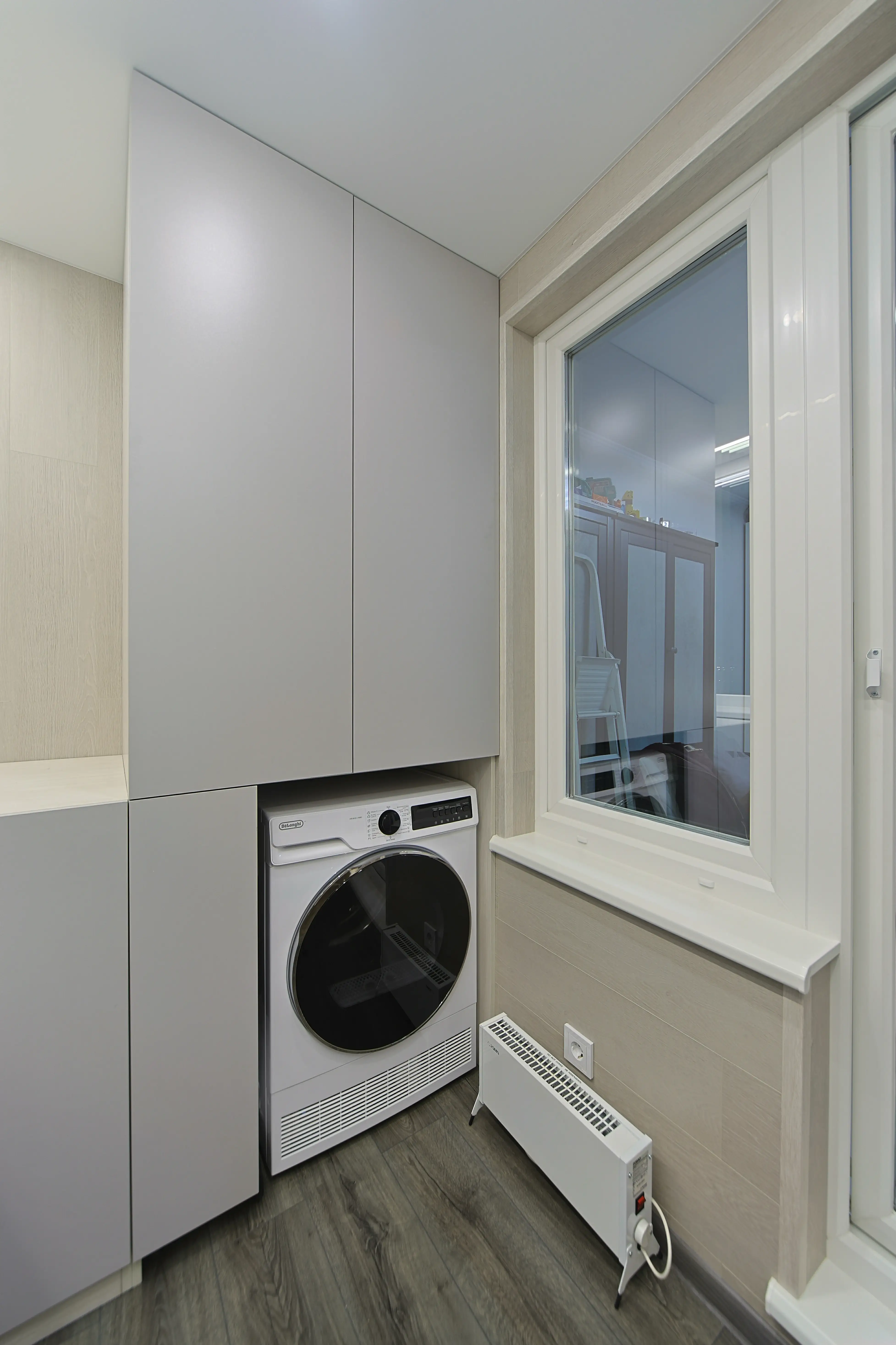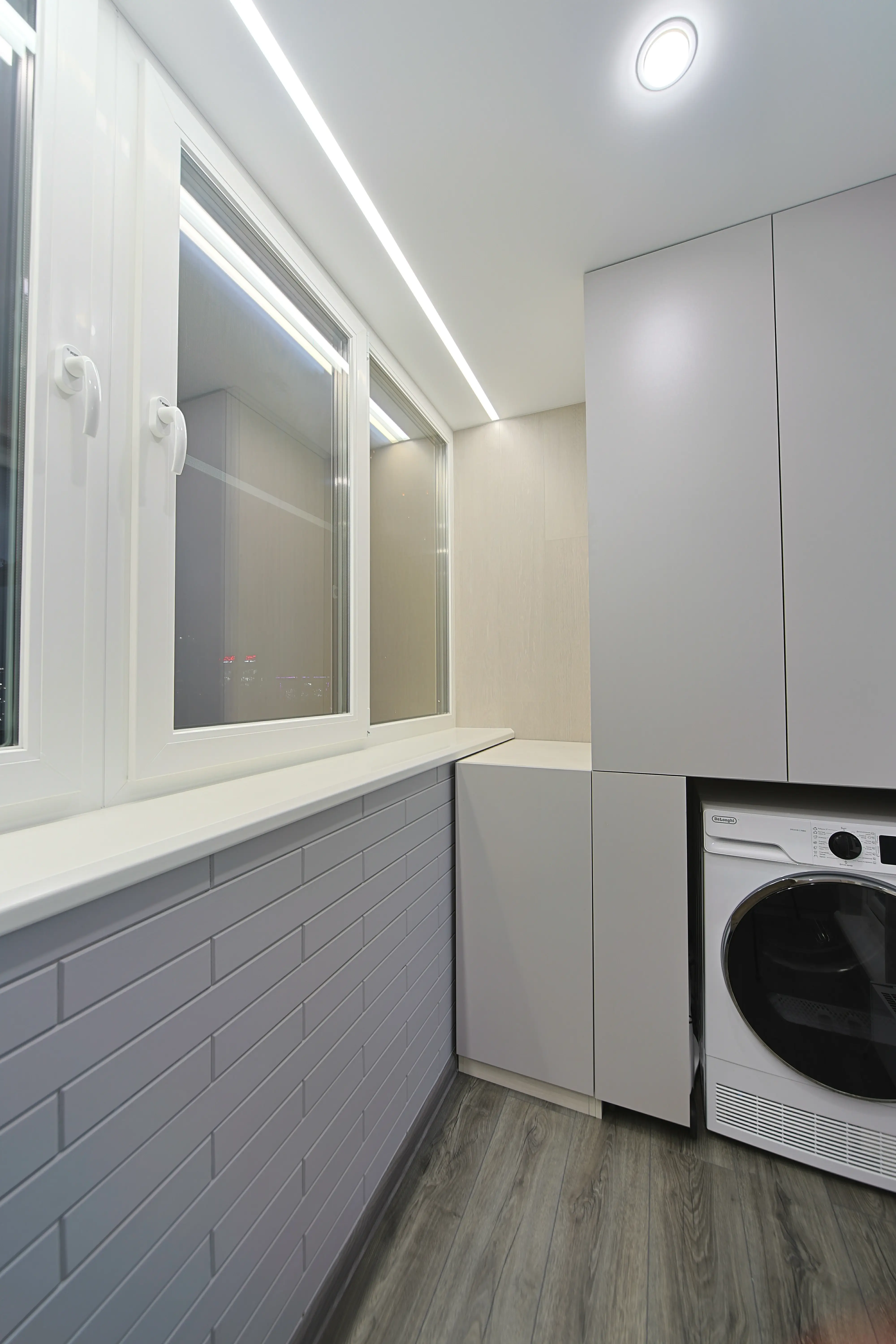 По меблировке и функционалу: с обеих сторон выполнены шкафы с учётом встроенной техники и дополнительных ниш; предусмотрено место под сушильную машину и организована зарядная станция для беспроводного пылесоса. Установлены белые матовые подоконники Duncan на парапете и в зоне балконного блока, смонтирован белый матовый натяжной потолок.