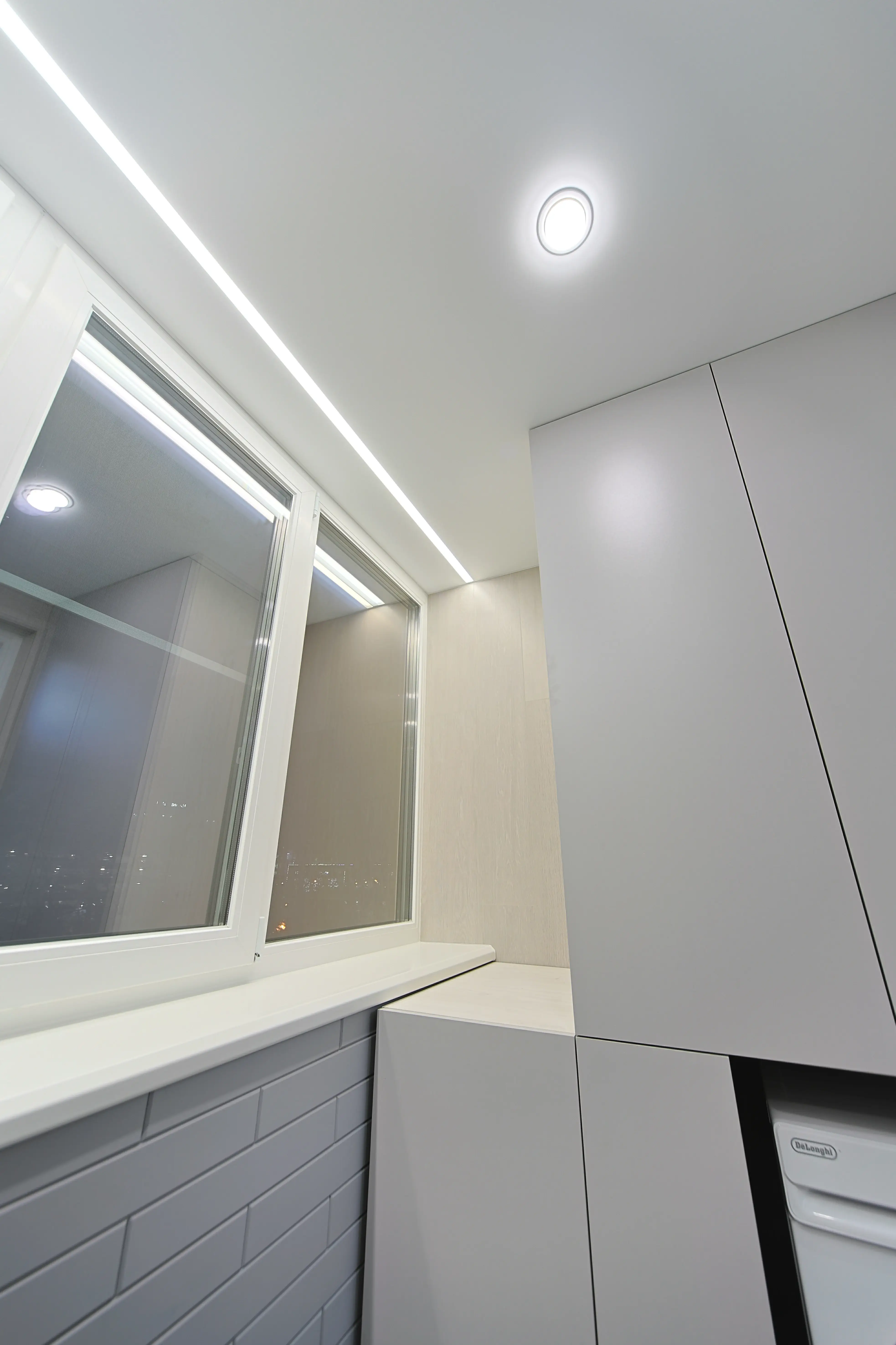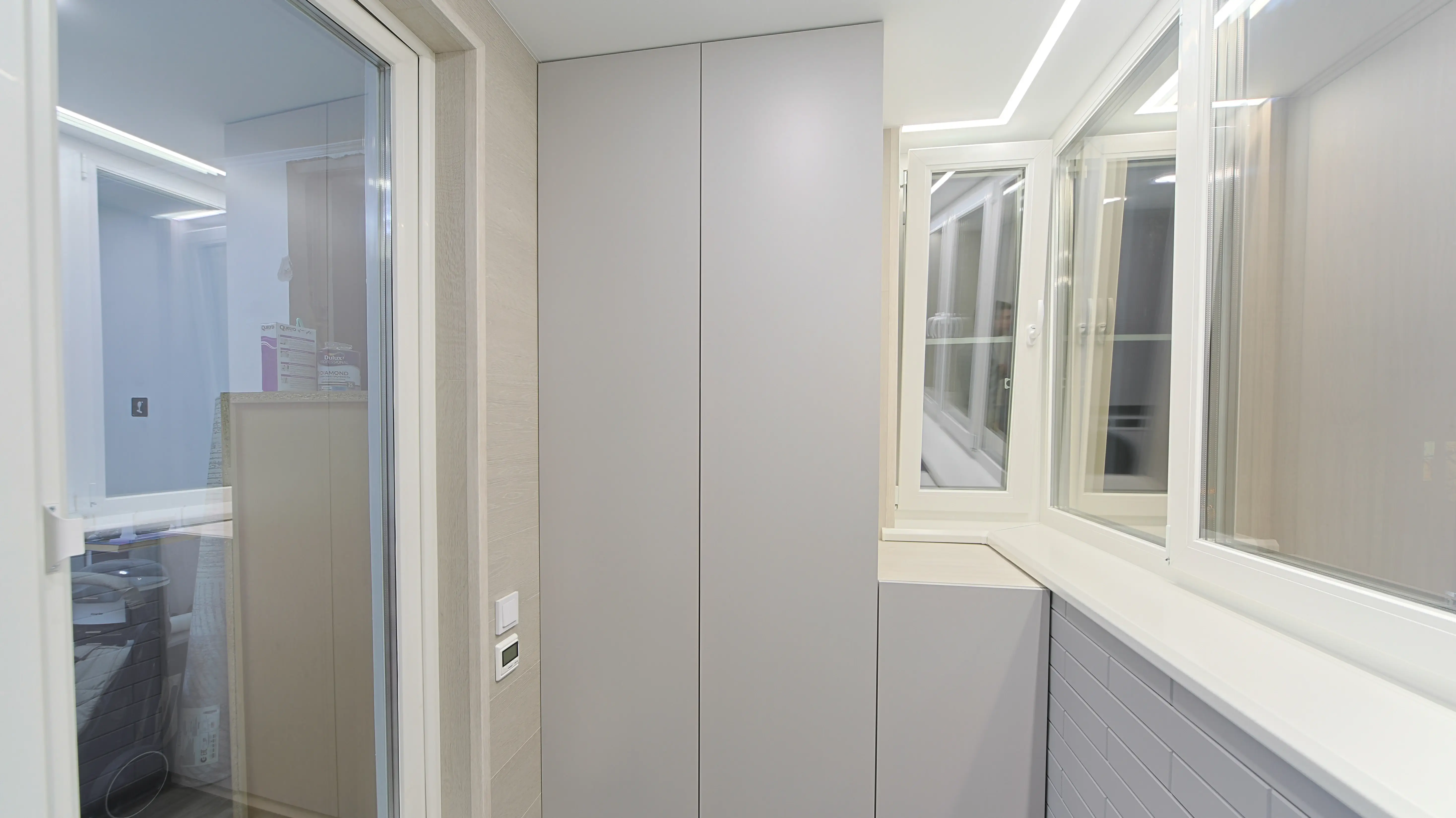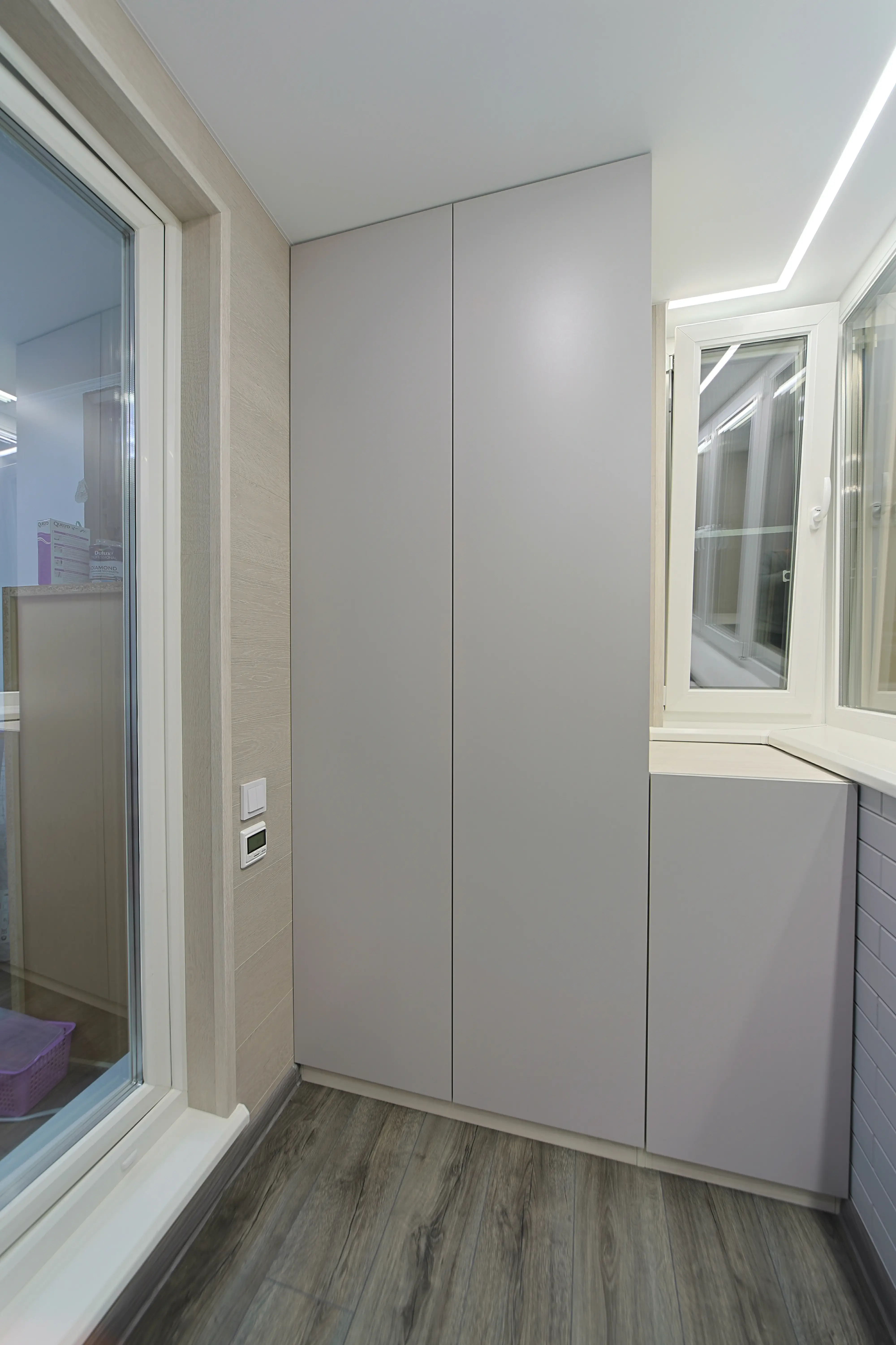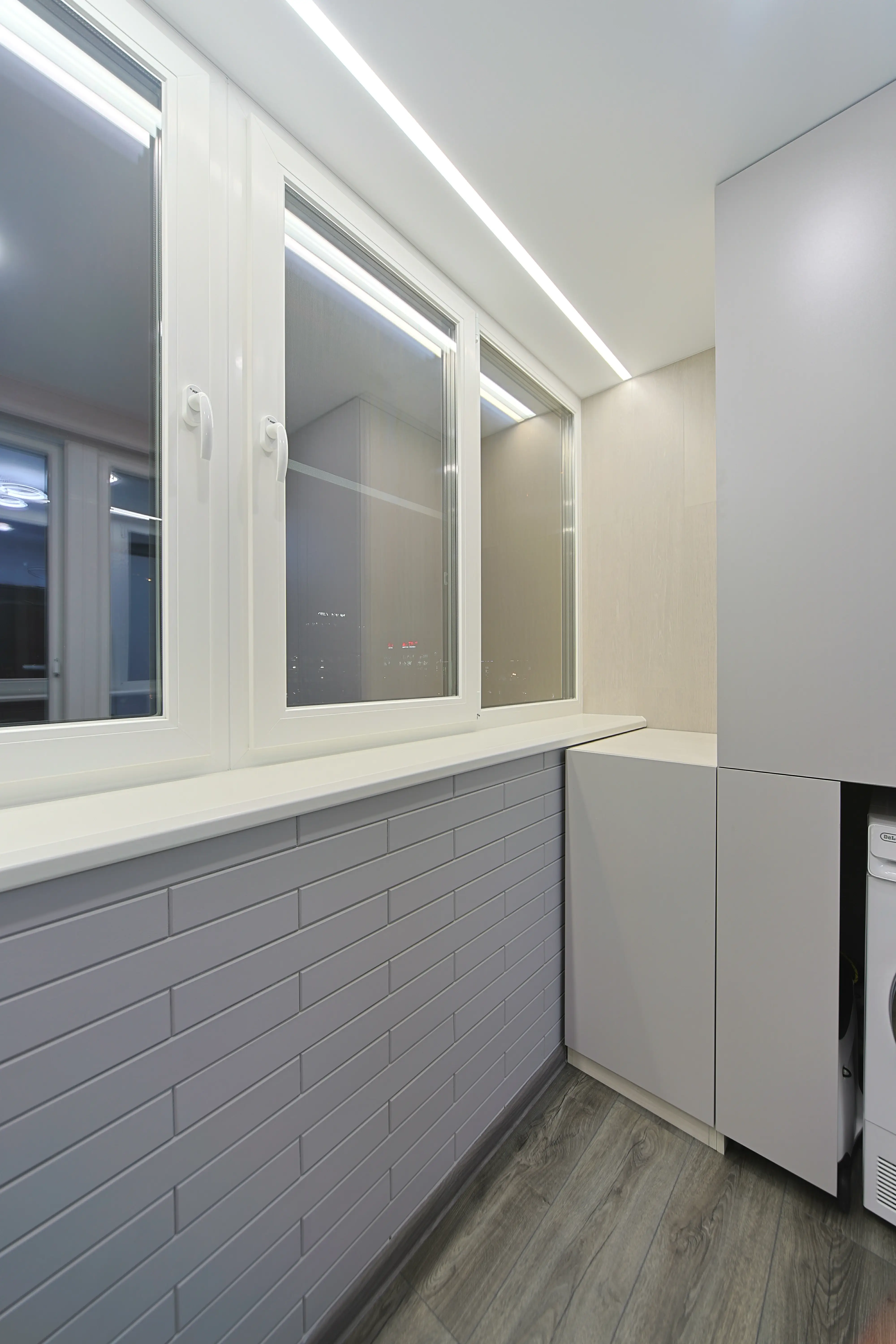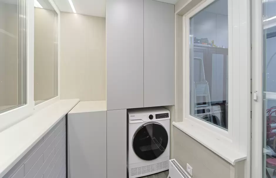 По меблировке и функционалу: с обеих сторон выполнены шкафы с учётом встроенной техники и дополнительных ниш; предусмотрено место под сушильную машину и организована зарядная станция для беспроводного пылесоса. Установлены белые матовые подоконники Duncan на парапете и в зоне балконного блока, смонтирован белый матовый натяжной потолок.