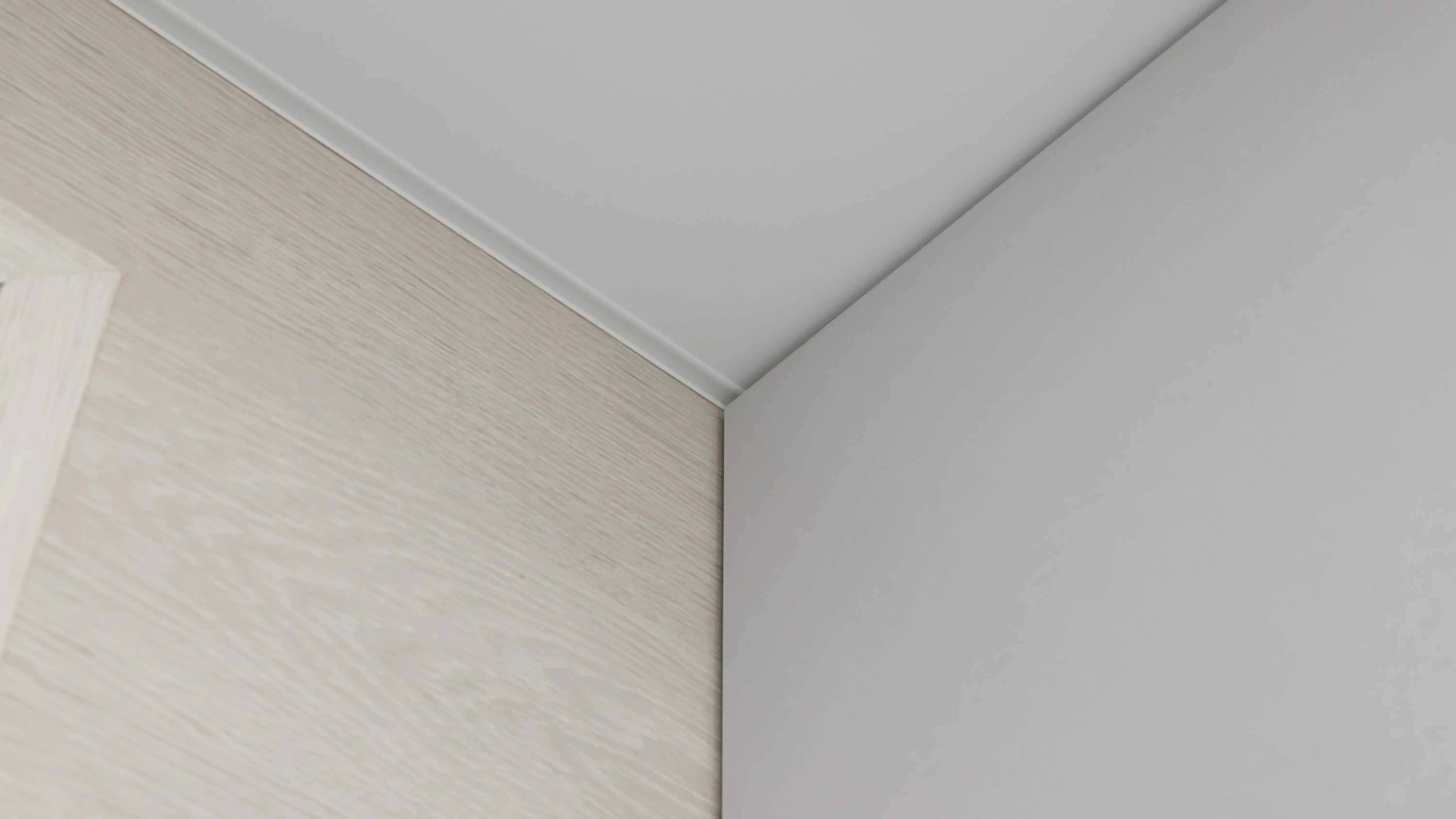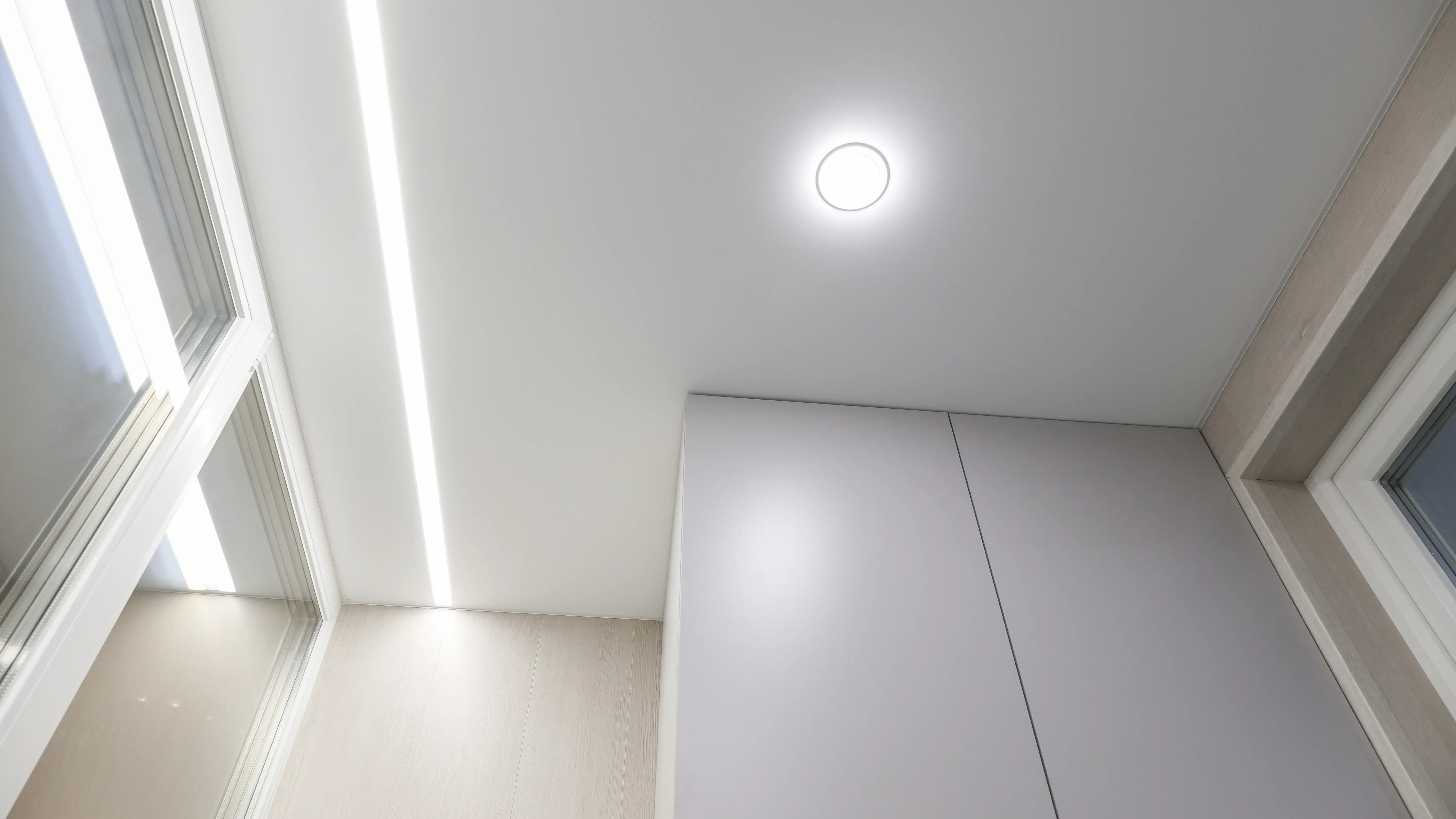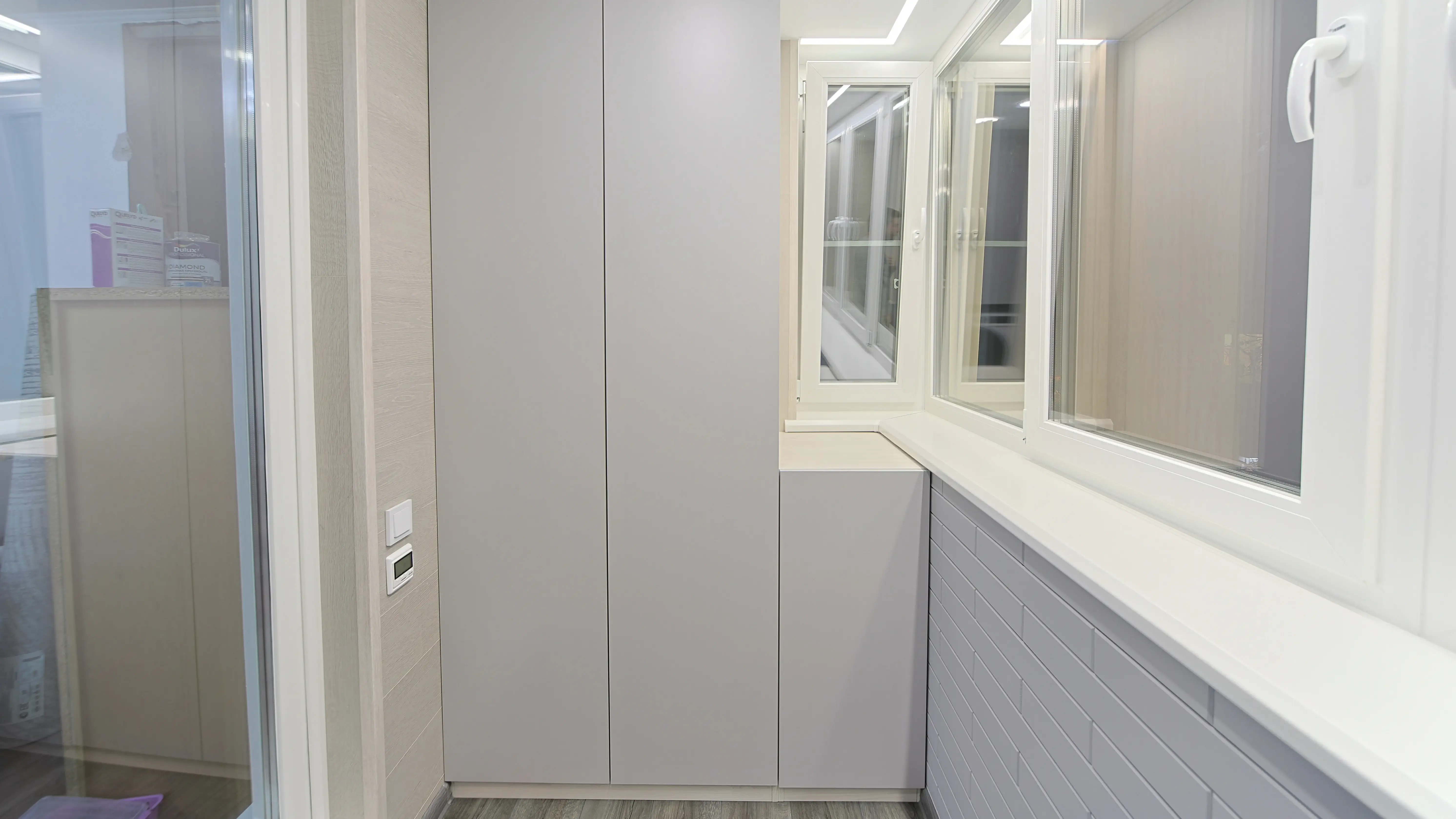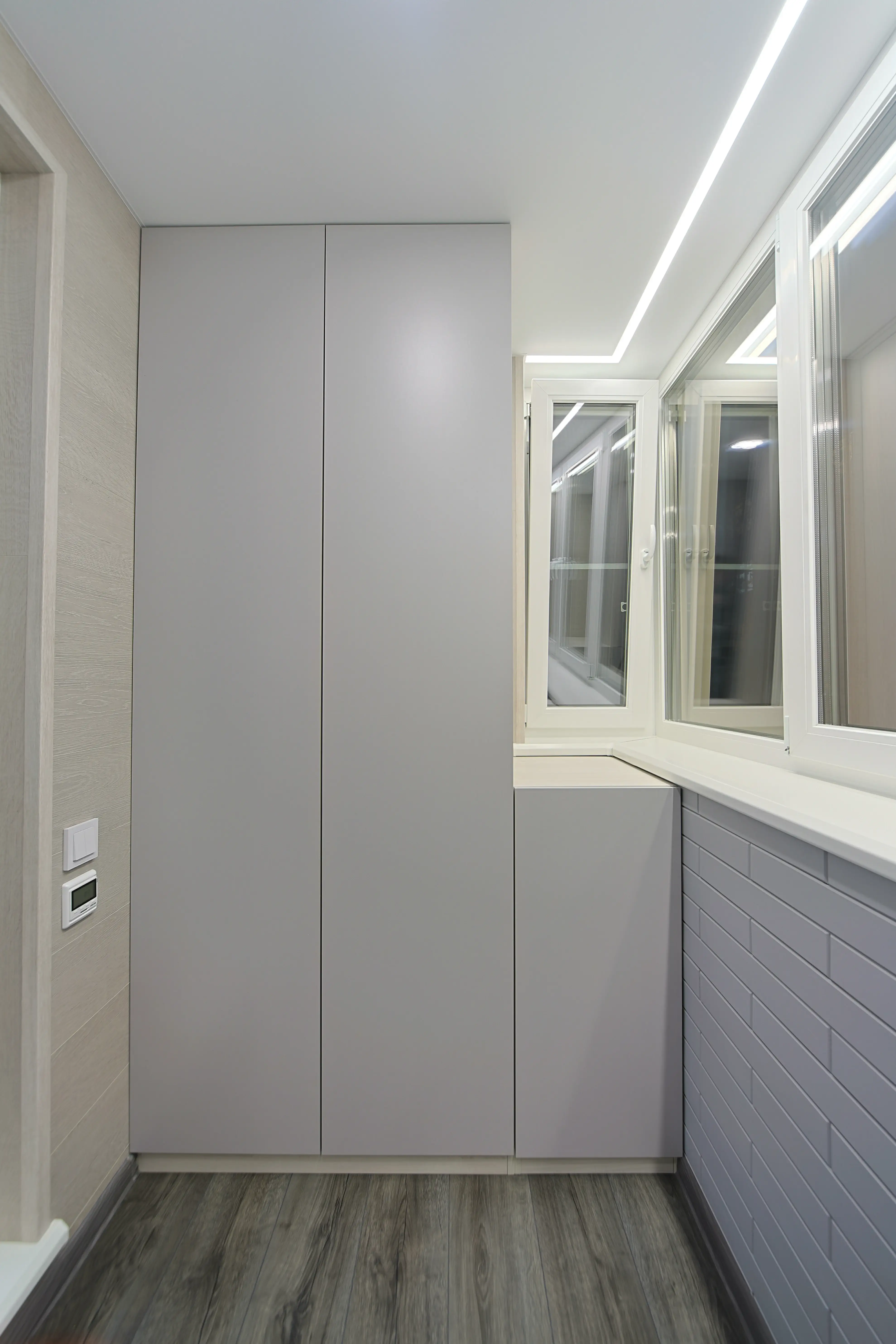 По меблировке и функционалу: с обеих сторон выполнены шкафы с учётом встроенной техники и дополнительных ниш; предусмотрено место под сушильную машину и организована зарядная станция для беспроводного пылесоса. Установлены белые матовые подоконники Duncan на парапете и в зоне балконного блока, смонтирован белый матовый натяжной потолок.