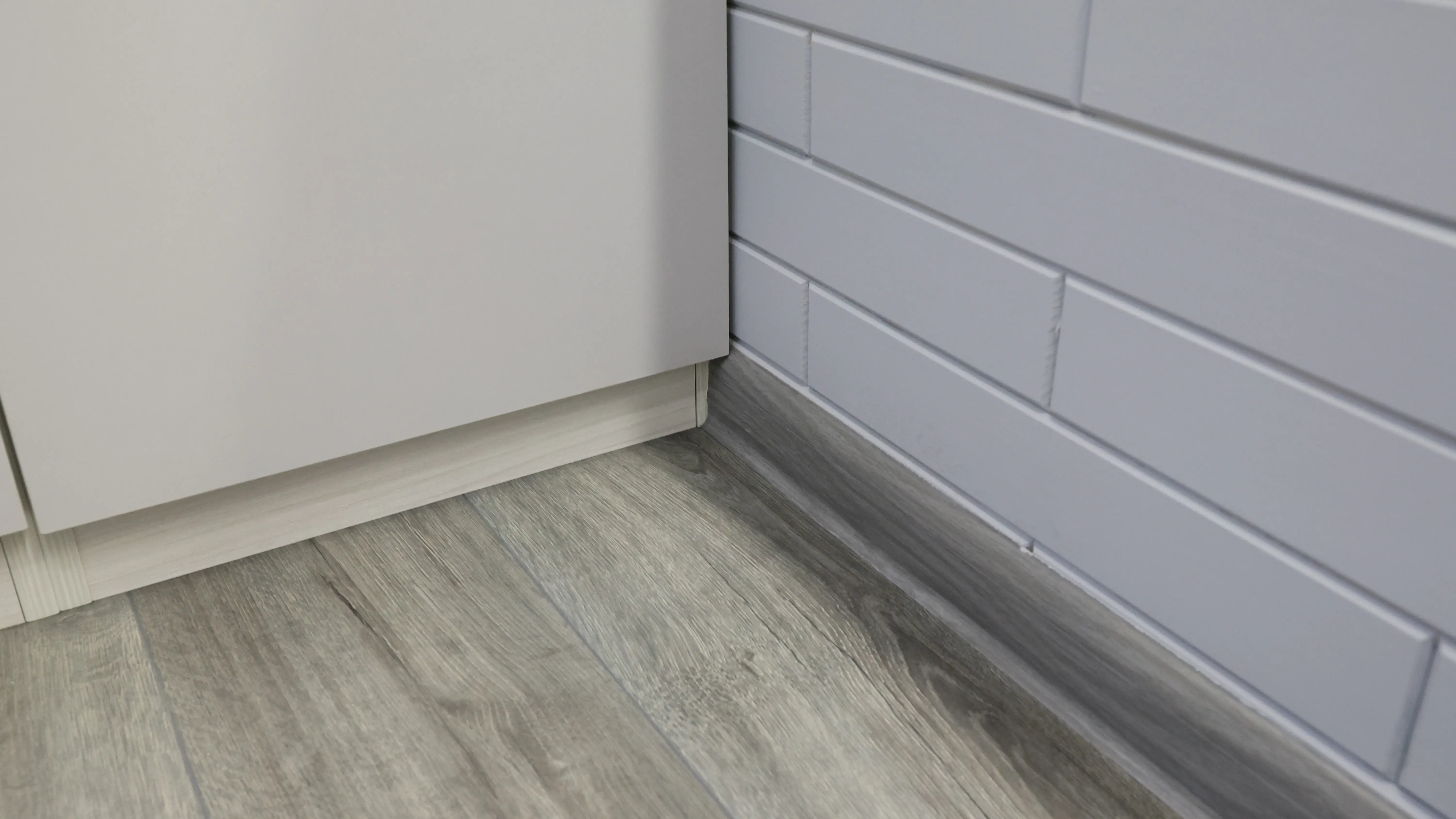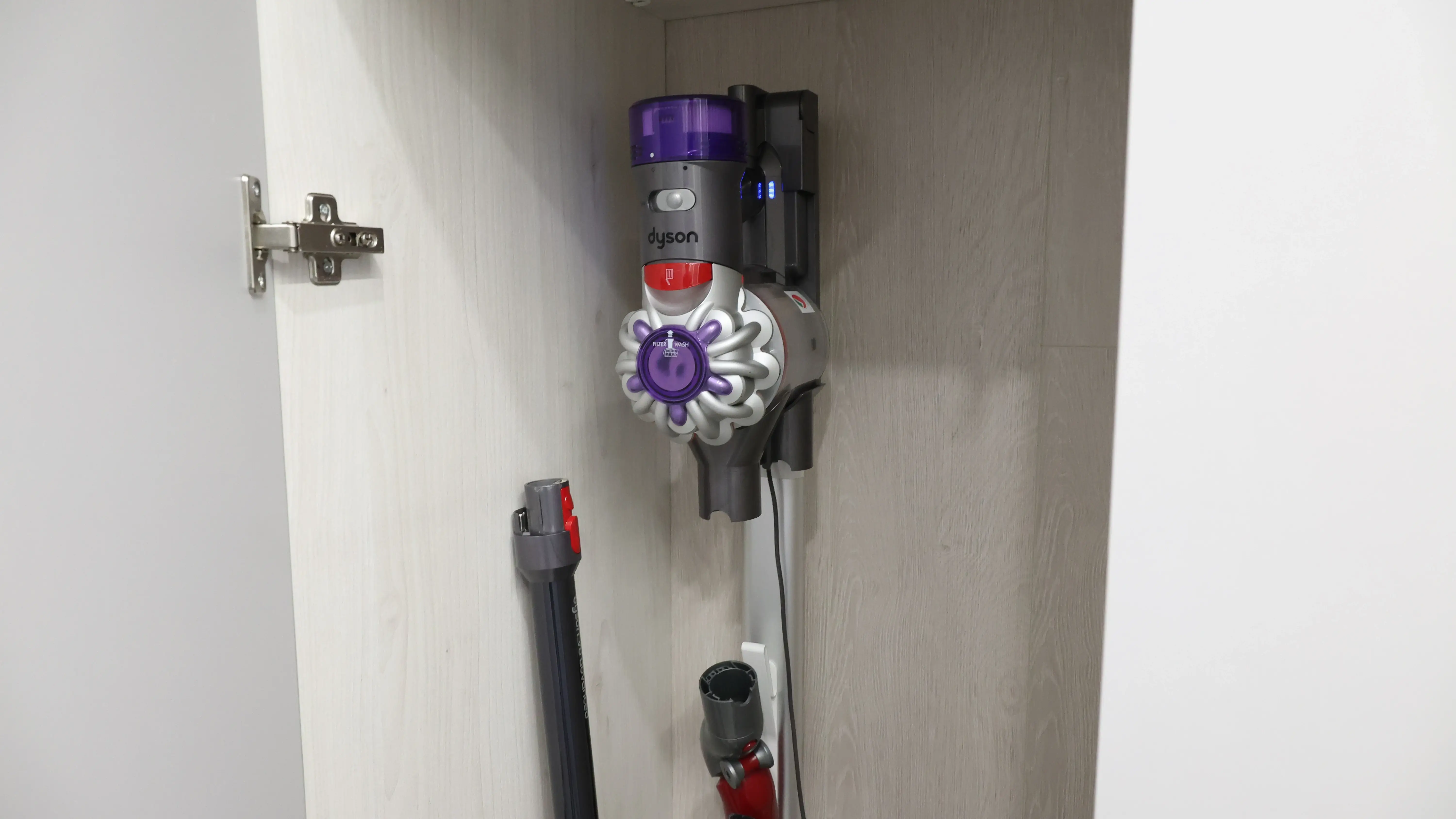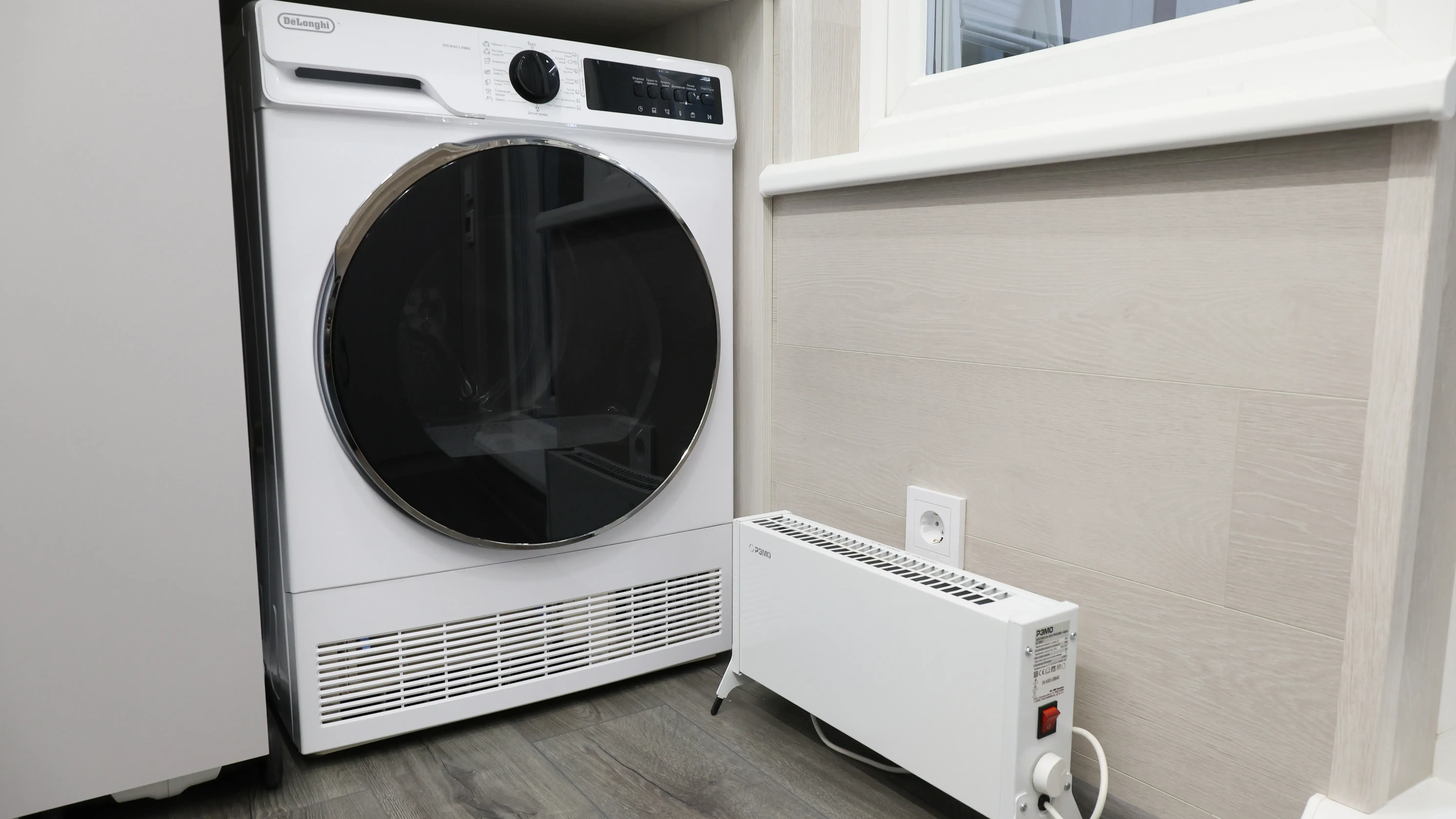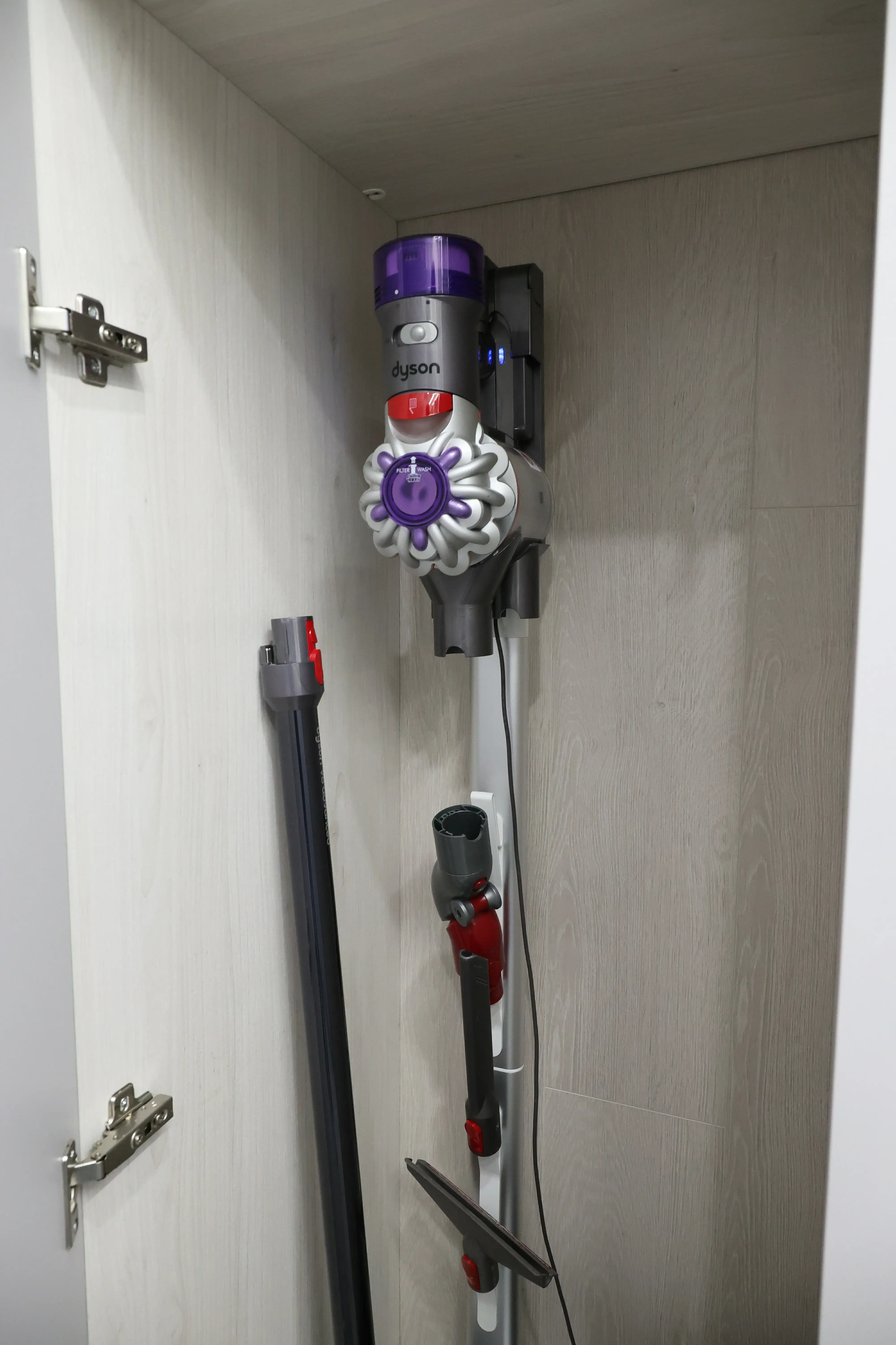 По меблировке и функционалу: с обеих сторон выполнены шкафы с учётом встроенной техники и дополнительных ниш; предусмотрено место под сушильную машину и организована зарядная станция для беспроводного пылесоса. Установлены белые матовые подоконники Duncan на парапете и в зоне балконного блока, смонтирован белый матовый натяжной потолок.