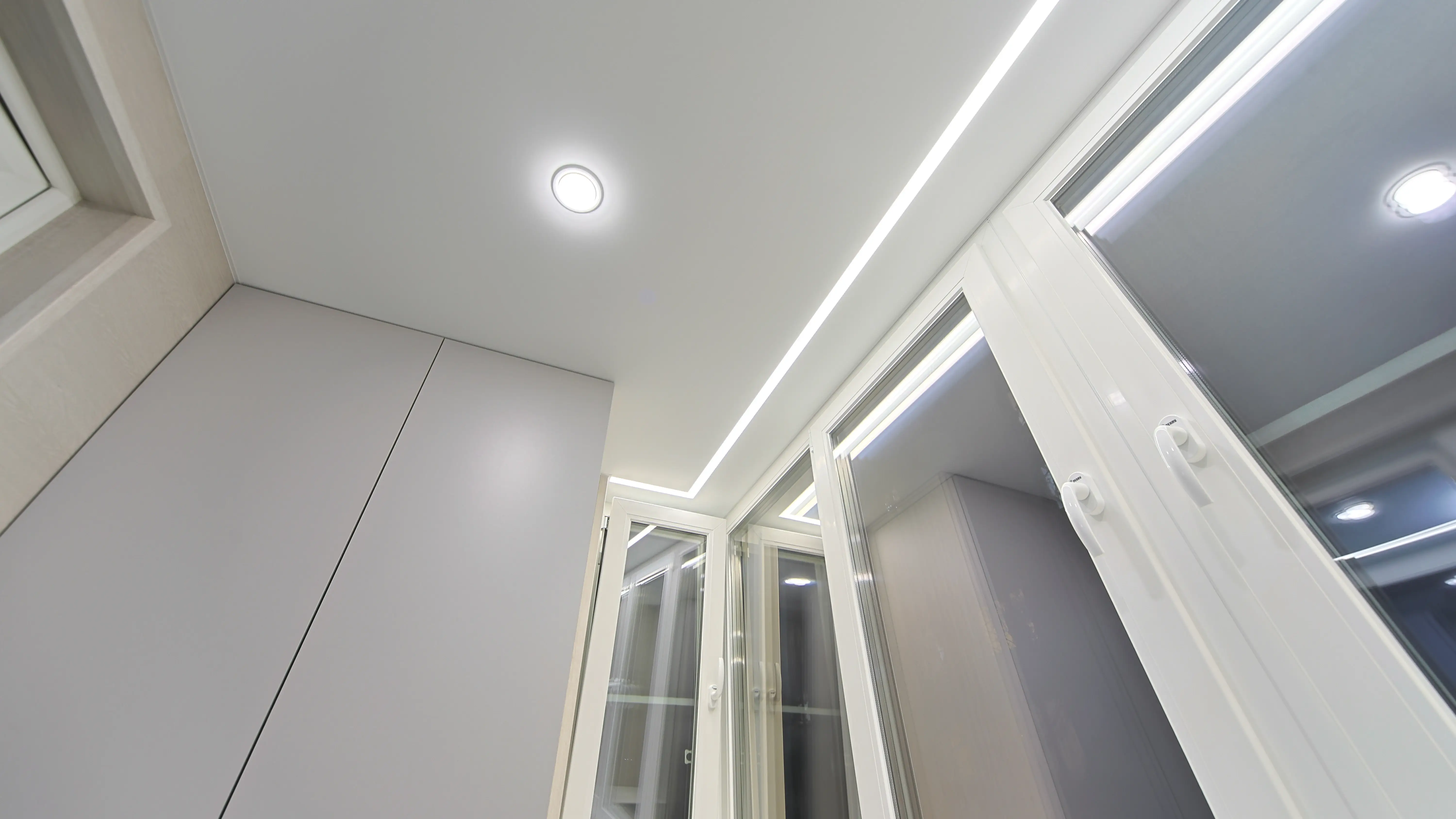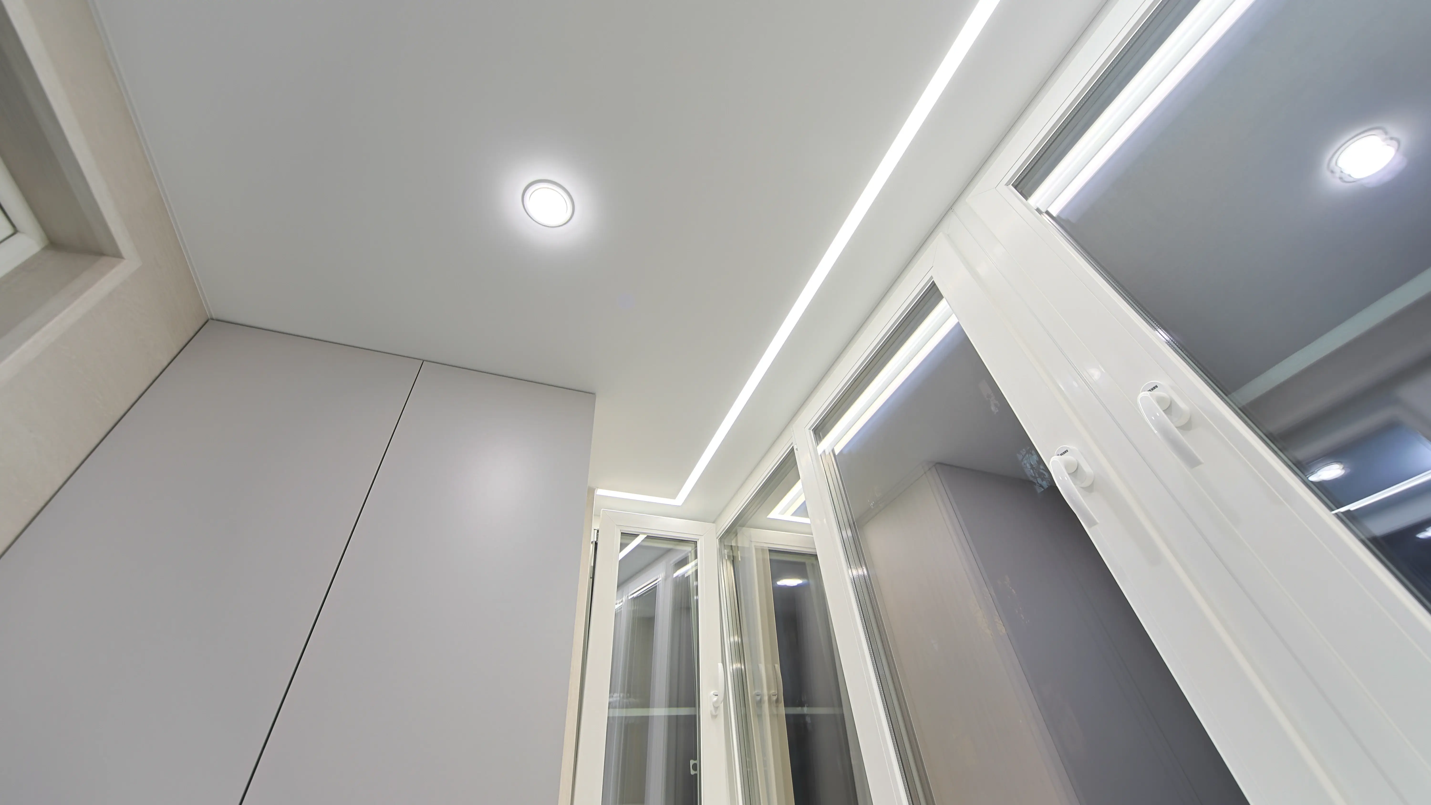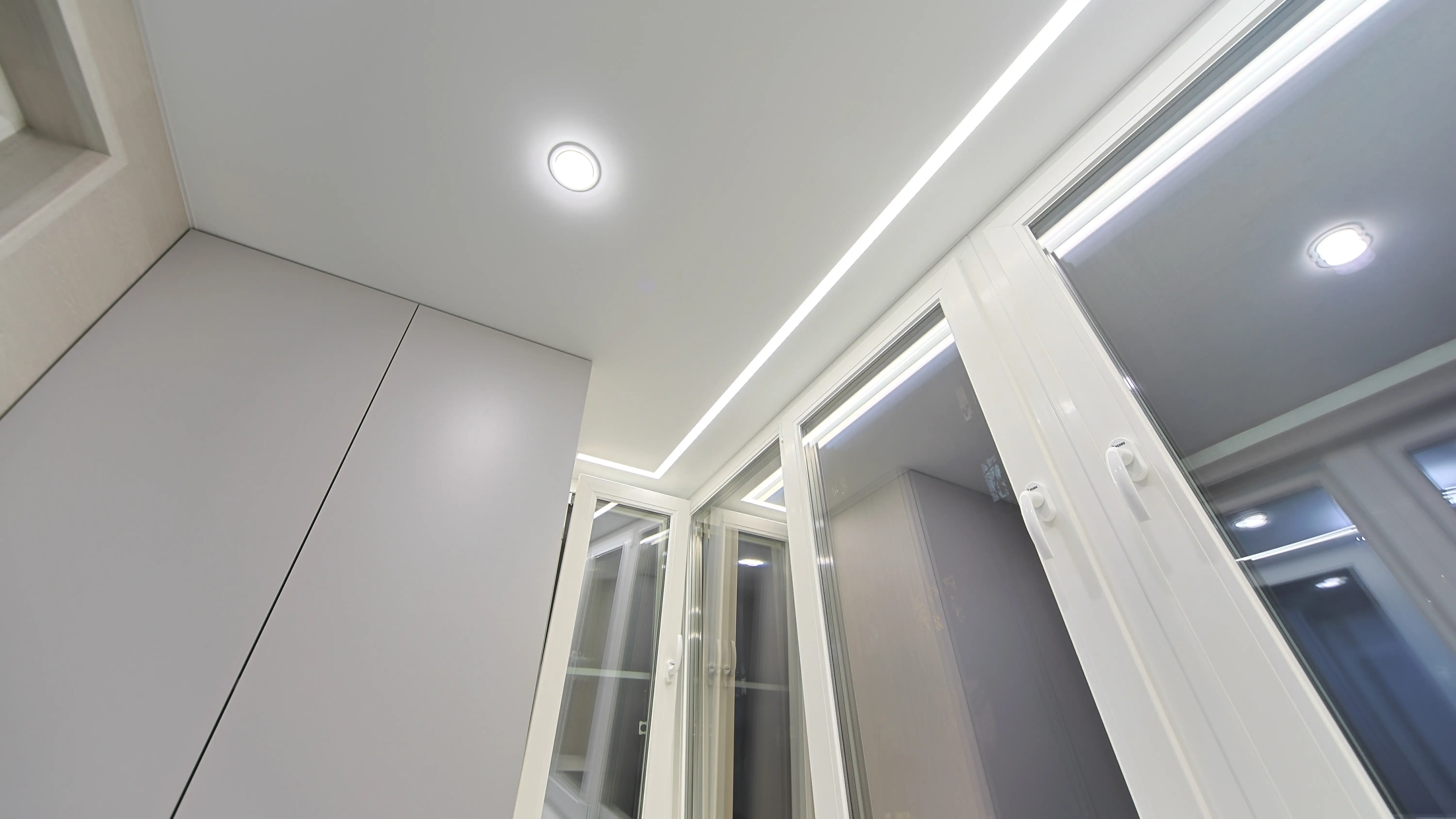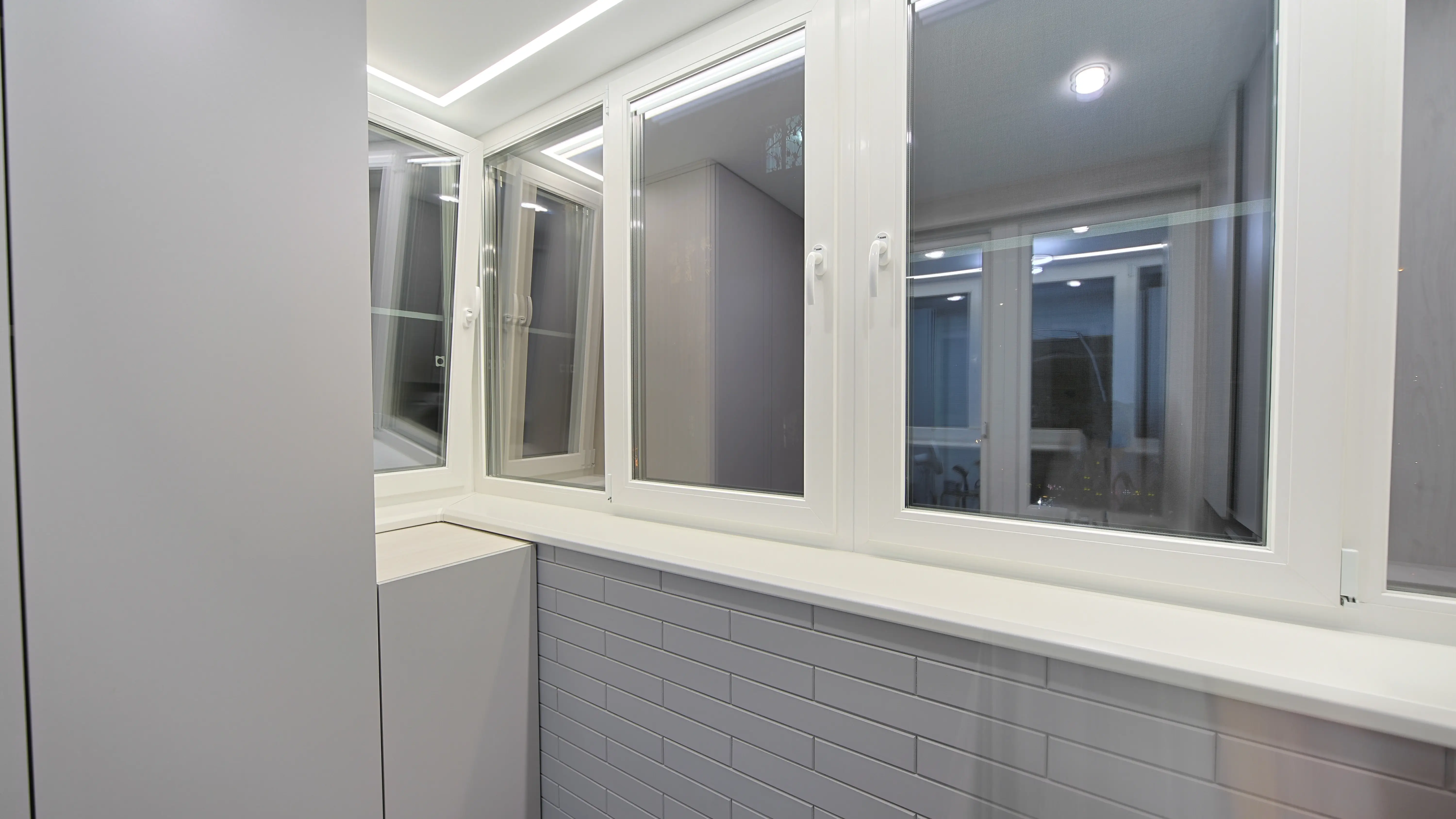 Основные этапы работ: заменено холодное остекление на тёплое — установлен профиль Rehau 70 с режимами откидывания и микрощелевого проветривания. Заменён балконный блок. Выполнено утепление по системе «термос». Стены облицованы влагостойким ламинатом, уложенным горизонтально, а парапет оформлен стеновым паркетом из липы, пропитанным в заданный оттенок. Пол также выполнен из ламината. Смонтирована новая проводка, установлены несколько розеток, тёплый инфракрасный пол под ламинатом с терморегулятором, двухзонный выключатель, два светодиодных спота и светодиодная лента.