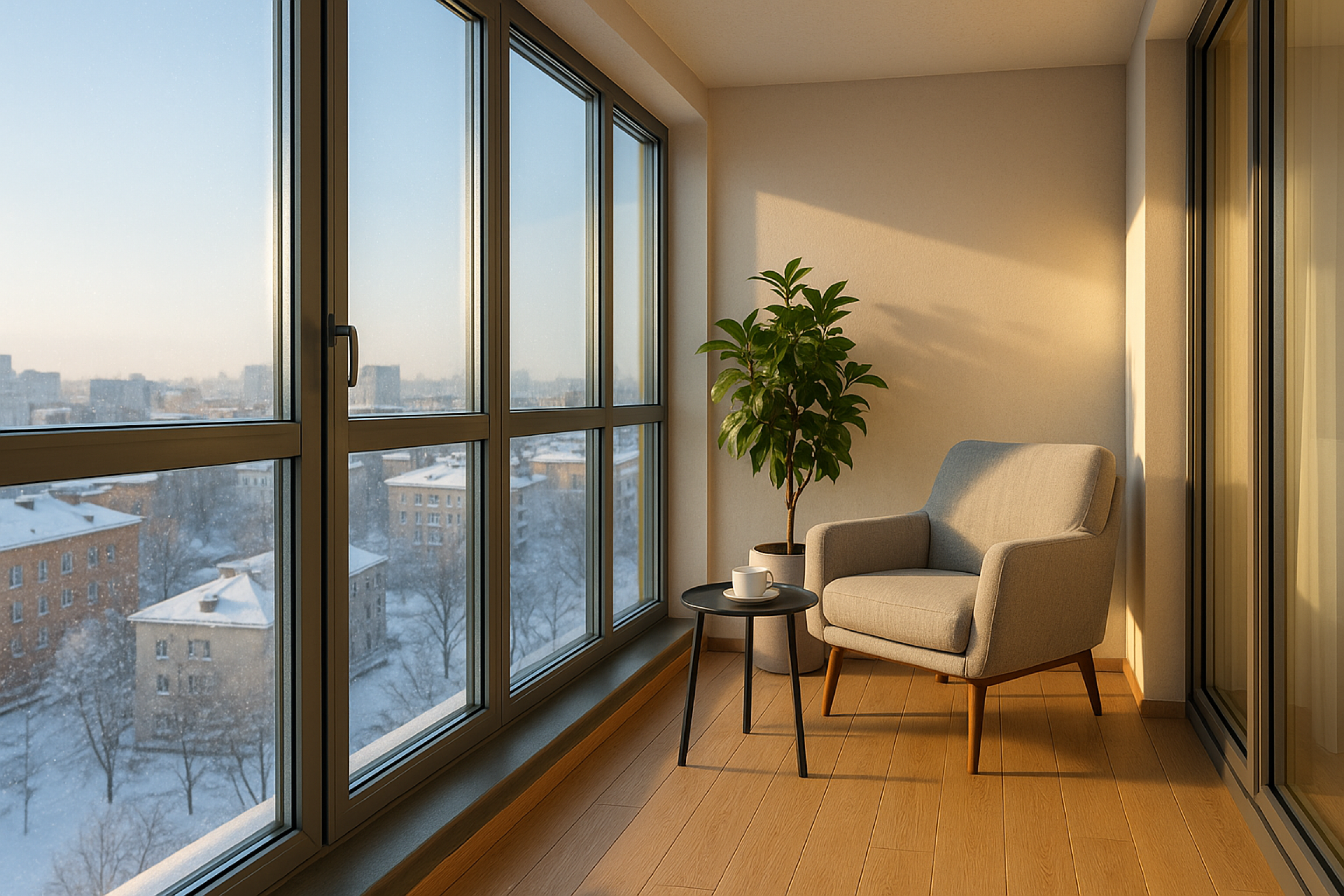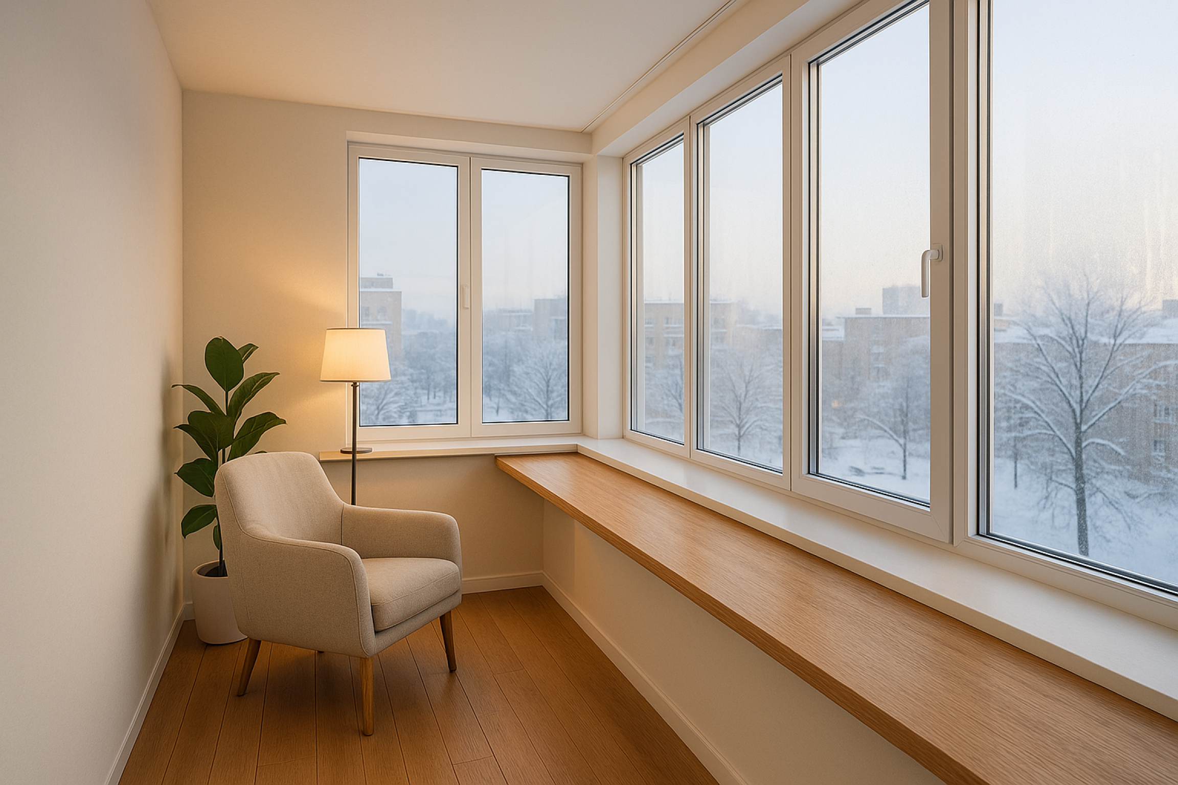Рабочий уголок, хранение, мини-спальня или спорт-зона — от сценария зависят требования к теплу и акустике. Для большинства квартир достаточно ПВХ-профиля 70–82 мм и двухкамерного стеклопакета 40–44 мм с Low-E, аргоном и тёплой рамкой.