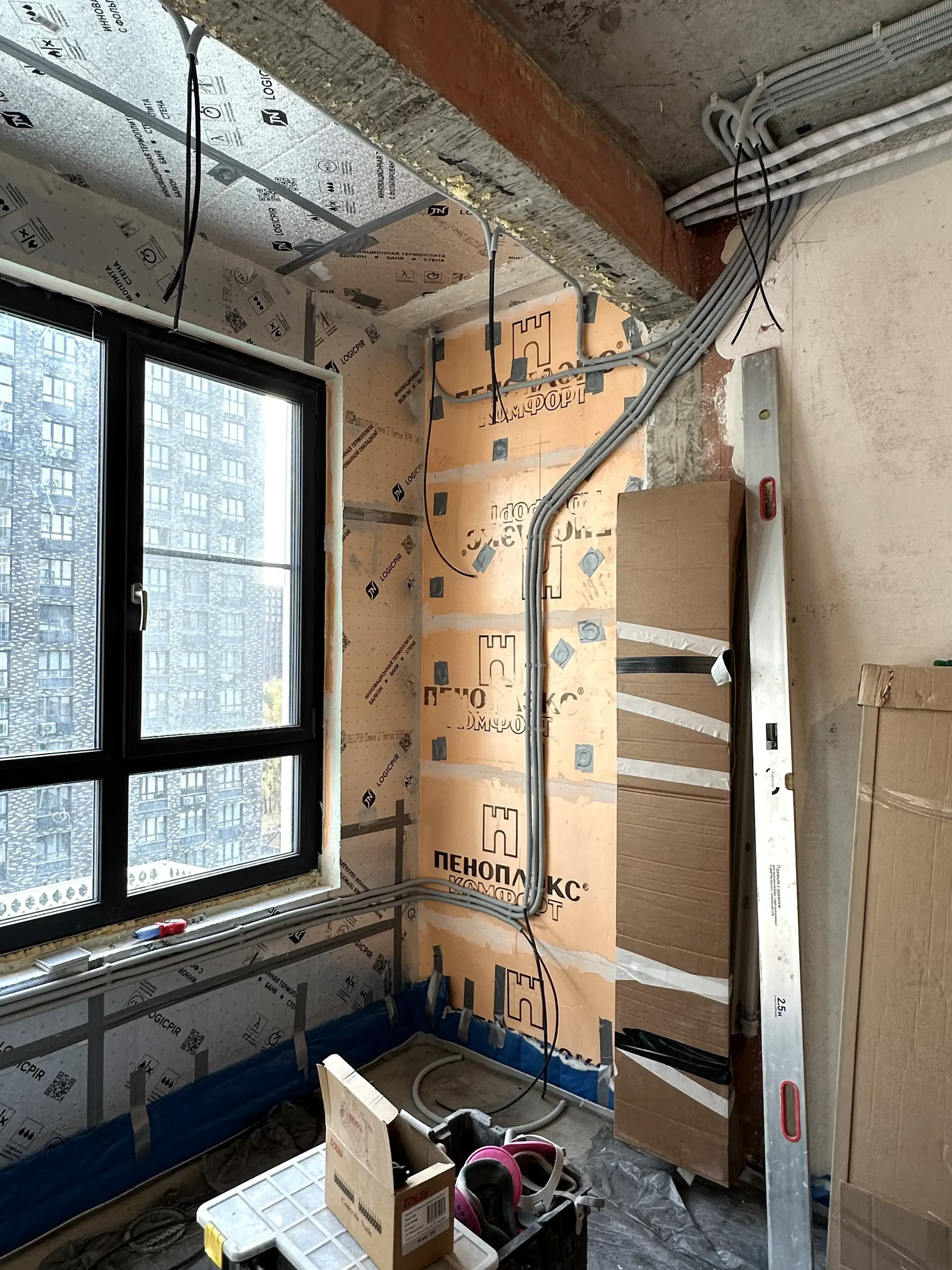 После завершения работ была проведена проверка тепловизором. Температура по поверхности пеноплекса составила около 21,7–22 °C, тогда как бетонные стены дома показали примерно 19,5 °C. Это наглядно подтвердило эффективность системы: утеплённые конструкции лоджии стали теплее основных стен здания.